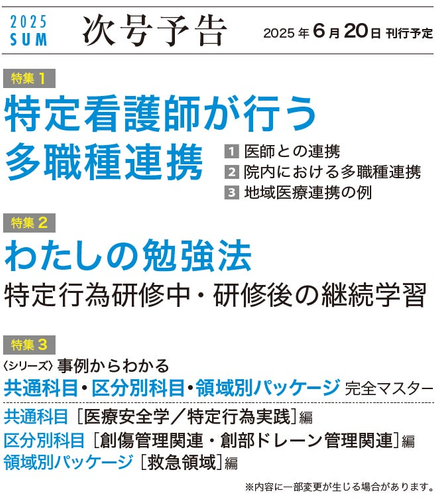 「特定行為研修修了者の実践事例が読みたい」という多くの声に応え、毎号、共通科目・区分別科目・領域別パッケージからそれぞれ1科目(領域)を取り上げ、特定行為を実践した事例について手順書とともに紹介します。特定行為研修修了者が臨床で遭遇しがちな、もしくは判断や対応などに迷う場面について、「医師からのコメント」としてその評価も掲載。実際の手順を具体的にイメージできる、実践ですぐに役立つシリーズ特集です。