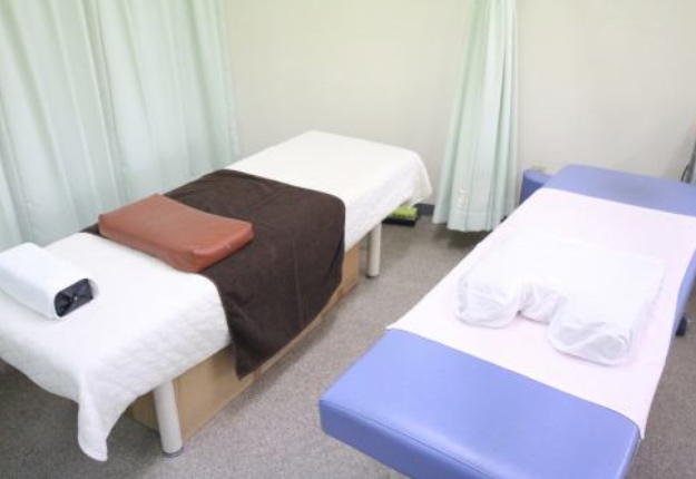 施術室の床は、フラットなフローリングで壁は白基調です。そのため、すっきりとした印象を与えてくれるでしょう。また、仕切りのカーテンは薄い緑色なので、優しく落ち着いた気分になれます。