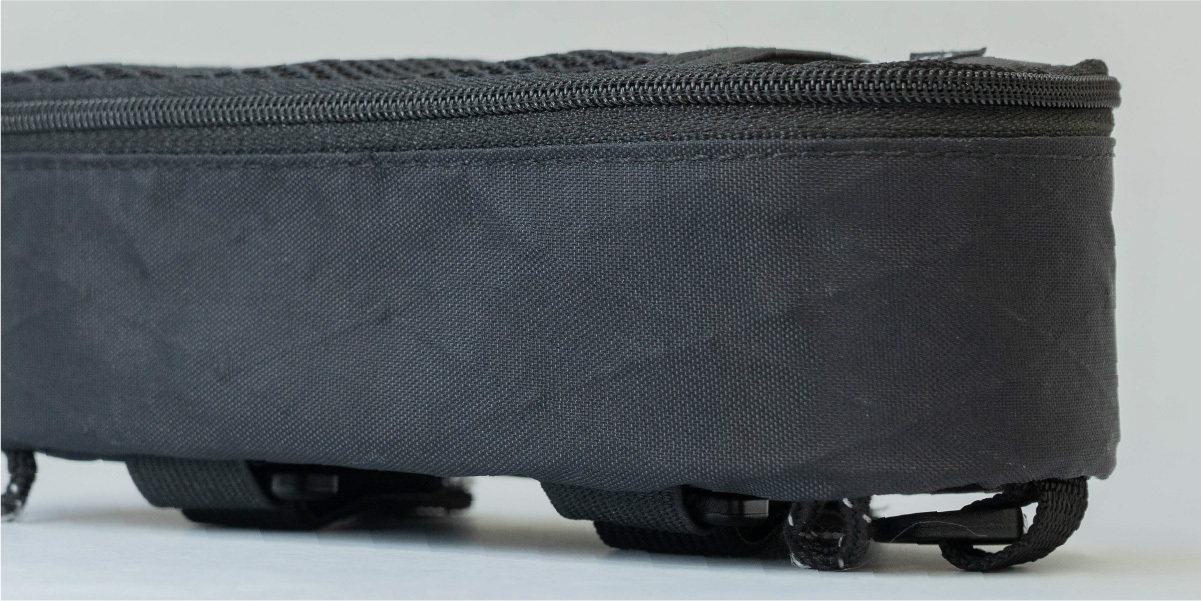使用しているX-PACは軽量・強度・防水性に優れた高機能素材。一般的なナイロン製に比べ軽いですが、強度は十分あり、簡単に破ける心配はありません。また、X-PACには高い防水性もあるため、突然の雨でも水の侵入を抑えます。