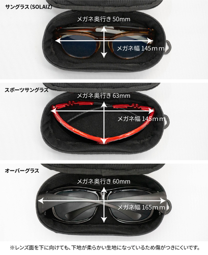 一般的なサイズのメガネから大きなオーバーグラスまで、様々なサイズのメガネが収納できます。