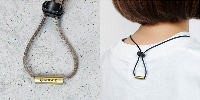 ロゴ入りの真鍮パイプは、デザインのアクセントとしてさりげない存在感を放ちます。首の後ろに適度な重みを加えることで、コード全体のバランスを整え、首元への負担をやわらげる役割も果たします。