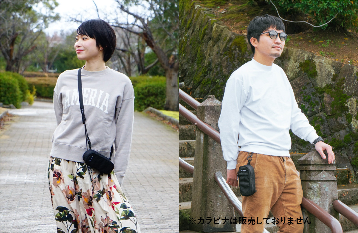 肩から掛けたり、カラビナを使って服につけたり、持ち運び方によって印象が変わり、ファッションアイテムとしても楽しんでいただけます。