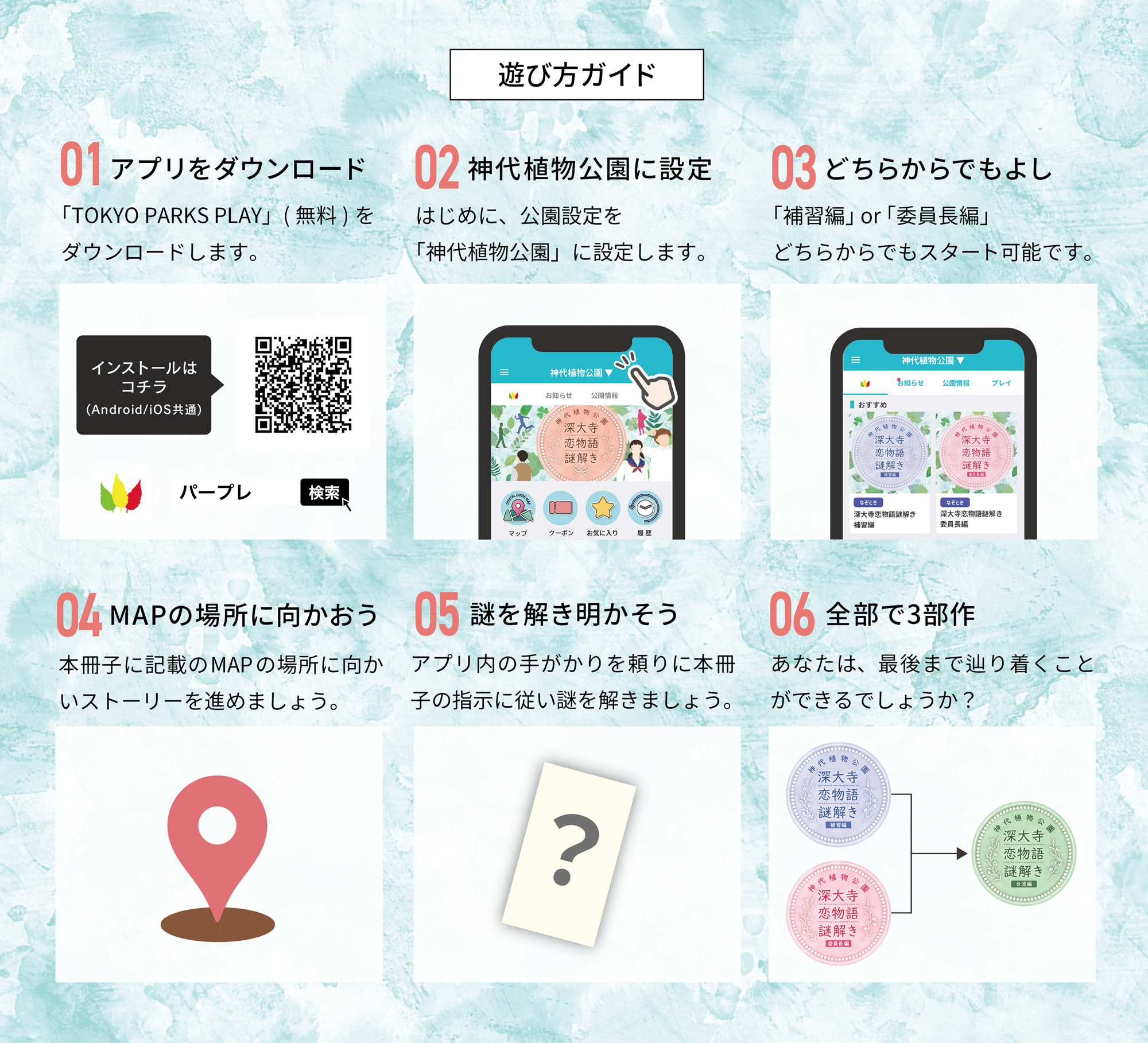 謎解きは、「補習」編(神代植物公園)、「委員長」編(深大寺周辺および水生植物園)、「合流」編(どこでも解くことが可能)の3部構成となっています。