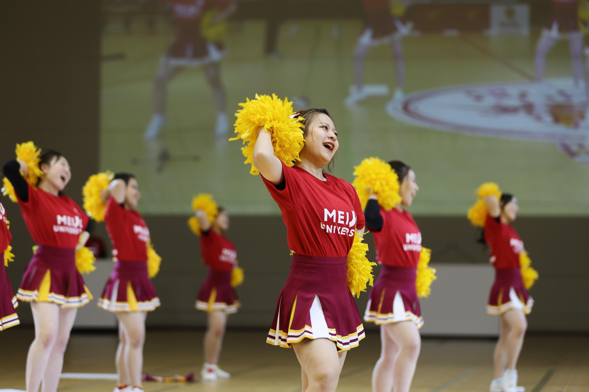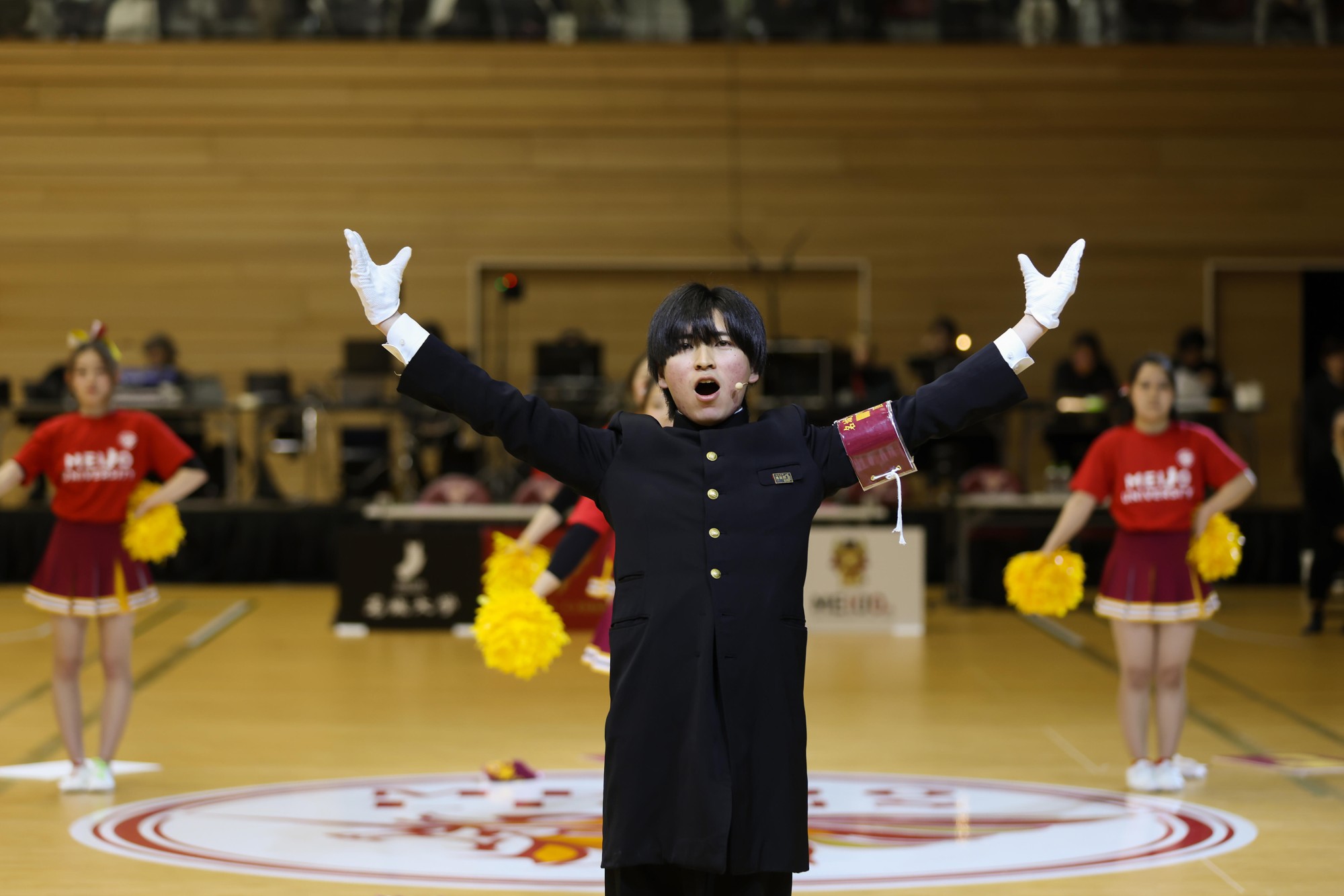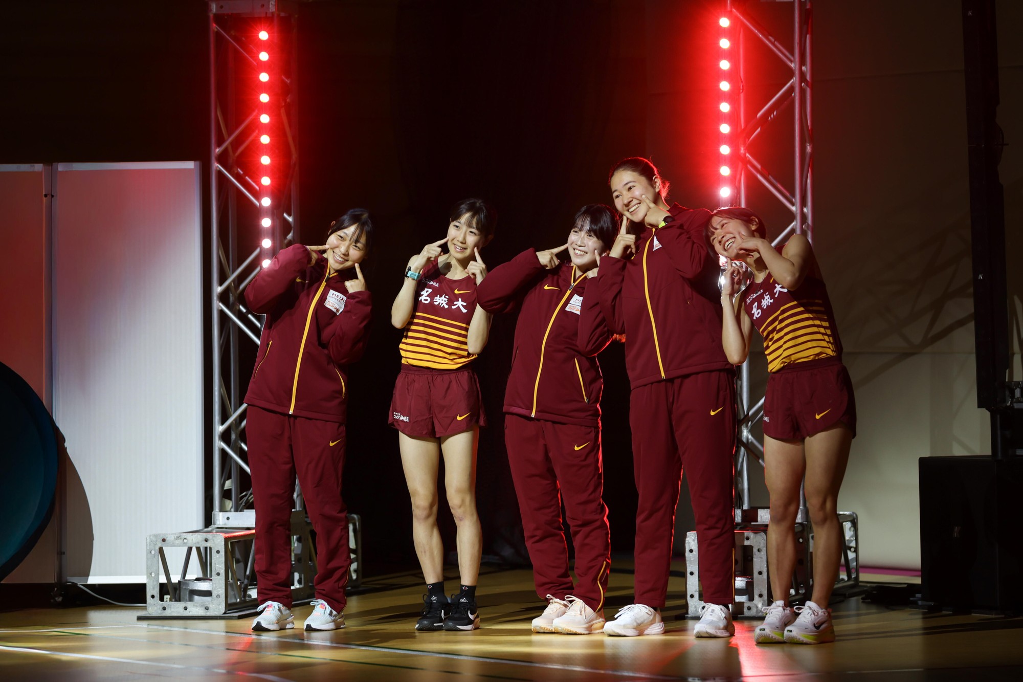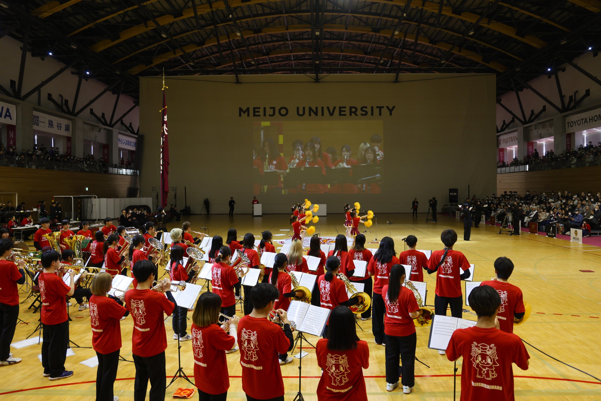 続いて、硬式野球部と女子駅伝部、アメリカンフットボール部、バレーボール部、ハンドボール部、ラグビー部の6クラブの選手たちが新ロゴマークをあしらった新ユニフォームを披露。さらに、應援團(リーダー部・チアリーディング部・吹奏楽部)が登場し、熱気あふれる応援パフォーマンスで初披露となる新応援歌「栄光掴み取れ」「勝利をつかめ」「名城レッドの心」や応援コールなどをアリーナ内に響かせ、学歌で締めくくると来場者から盛んな拍手が送られていました。