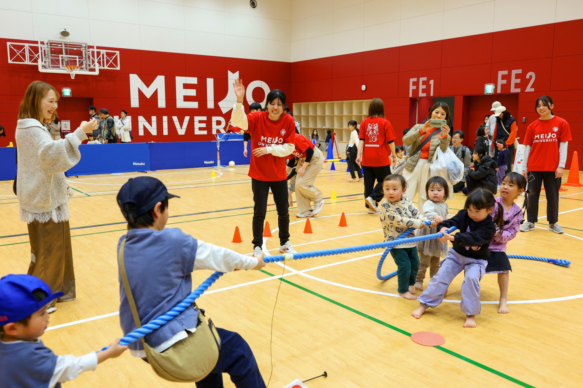 本学が2026年5月に迎える開学100周年記念事業の一環として天白キャンパスに建設した「名城大学開学100周年記念アリーナ」の竣工記念イベント「LIONS ARENA完成記念FESTA-100年の感謝を未来へ-」が3月14日、LIONS ARENAで開催されました。来場者は約2600人に上り、真新しいアリーナをじっくり見学するとともに、新しいマスコットキャラクターのお披露目やハンドボール部の交流戦、子ども向けの体験教室や教育・研究成果の展示など多彩なプログラムを楽しみました。