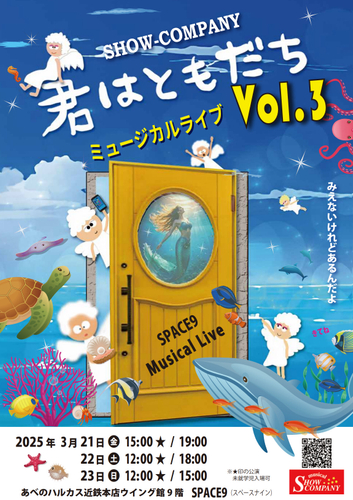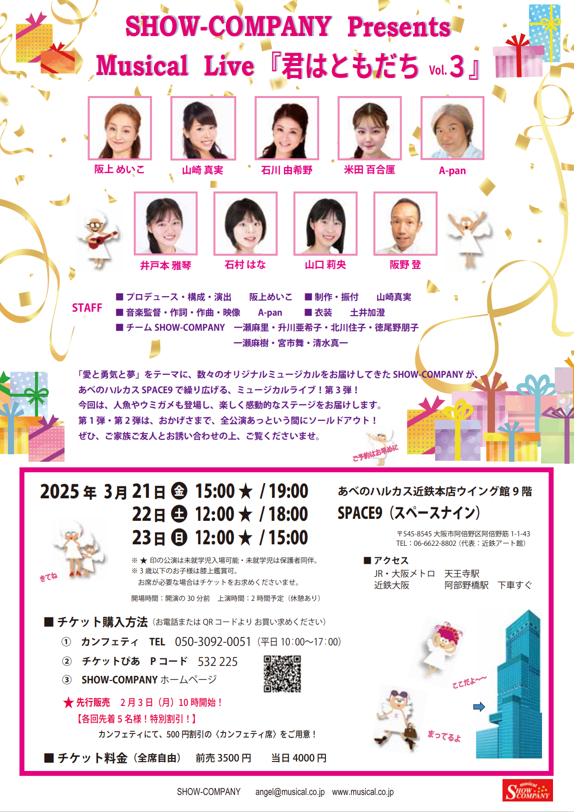 SHOW–COMPANY(代表:阪上めいこ)主催、Musical Live『君はともだち』Vol.3が2025年3月21日 (金) 〜 2025年3月23日 (日)にSPACE9(あべのハルカス近鉄本店ウイング館9階 大阪府 大阪市阿倍野区 阿倍野筋 1-1-43)にて上演されます。