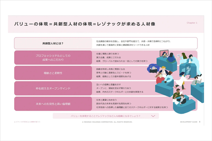 旧昭和電工の幅広い素材の技術と、旧日立化成のアプリケーションに近い機能を発現する力を一気通貫にすることで、社会で求められる機能を創出し、イノベーションを起こせるということ。また、それは社内にとどまらず、社外のステークホルダー、顧客、ベンダーとの共創を通して顧客の求めるものを作り出していくということ。同社の価値の源泉は、そうした「共創」ができる「人材」にあるとし、必要な人材を『共創型人材』と定義。