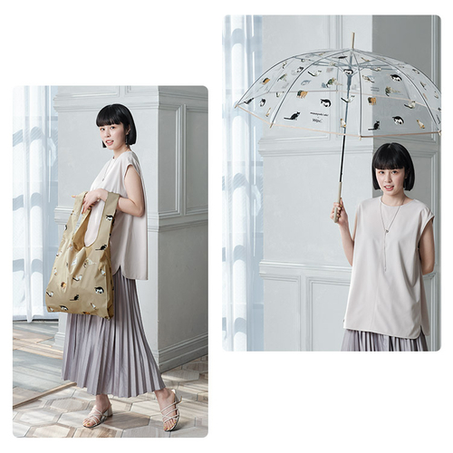 雨の日でもおでかけが楽しくなるような猫がいっぱいのビニール傘とエコバッグ。傘やエコバッグのデザインに登場している猫は、SNSの人気投票で選ばれた猫たちです。「ぶさにゃん先輩。」「チャトラ猫」「イケメン猫」の3つのデザイン展開です。