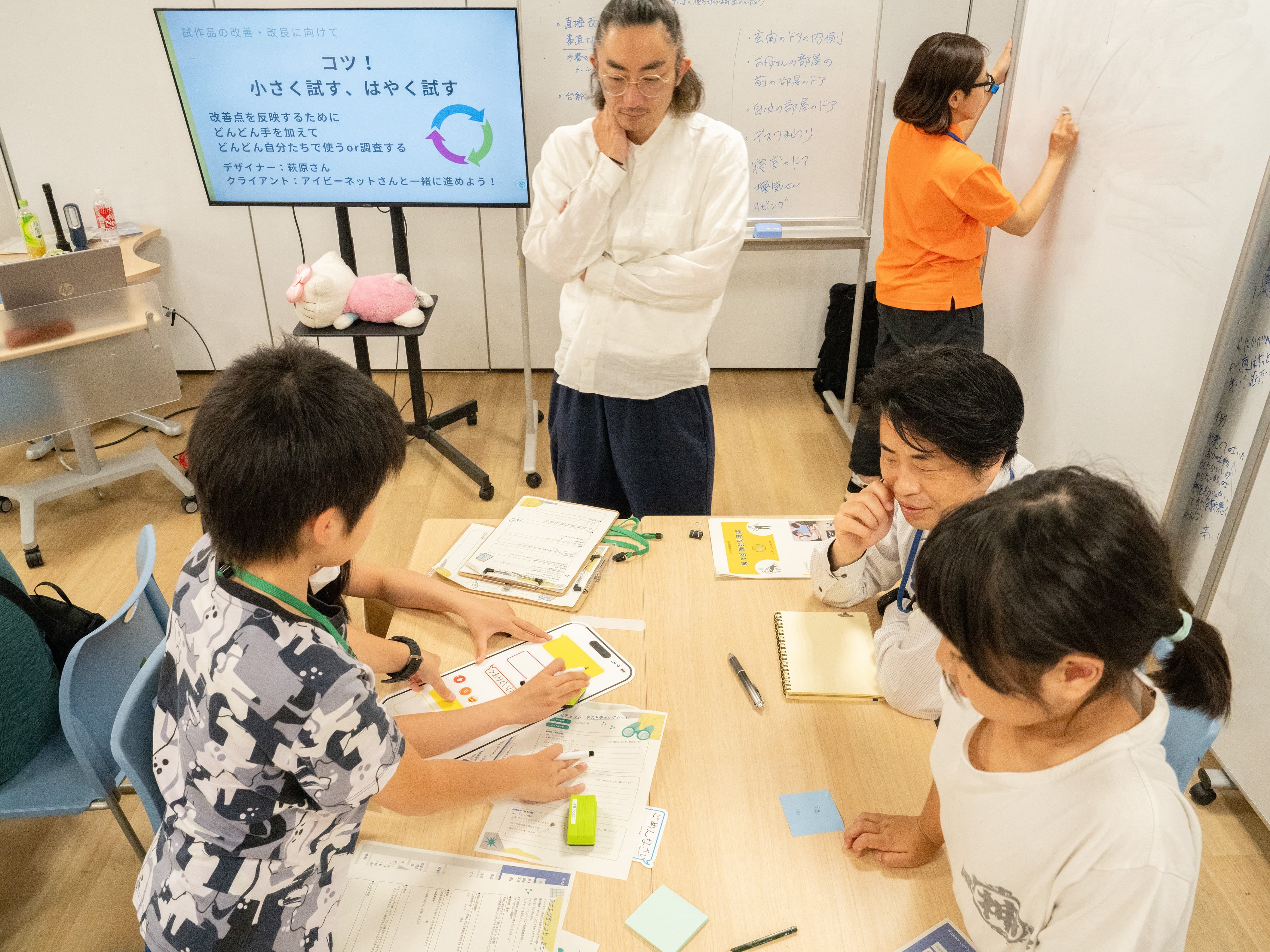 初回のワークショップでは、子ども達に商品開発部の名刺が配られ、大学生や大人との名刺交換からスタート。ターゲット分析からインサイトの抽出を経て商品コンセプトを練り上げていく、大人顔負けの開発会議を行いました。