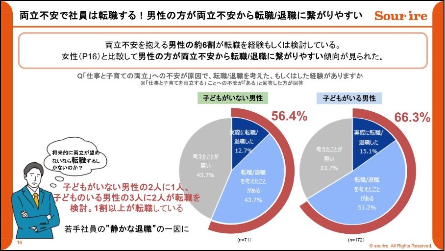 [結果]両立不安を抱えた子どものいる男性の66.3%が「退職・転職を考えたことがある」「実際に転職/退職した」と回答。この割合は子どもがいない男性でも56.4%に及ぶ。