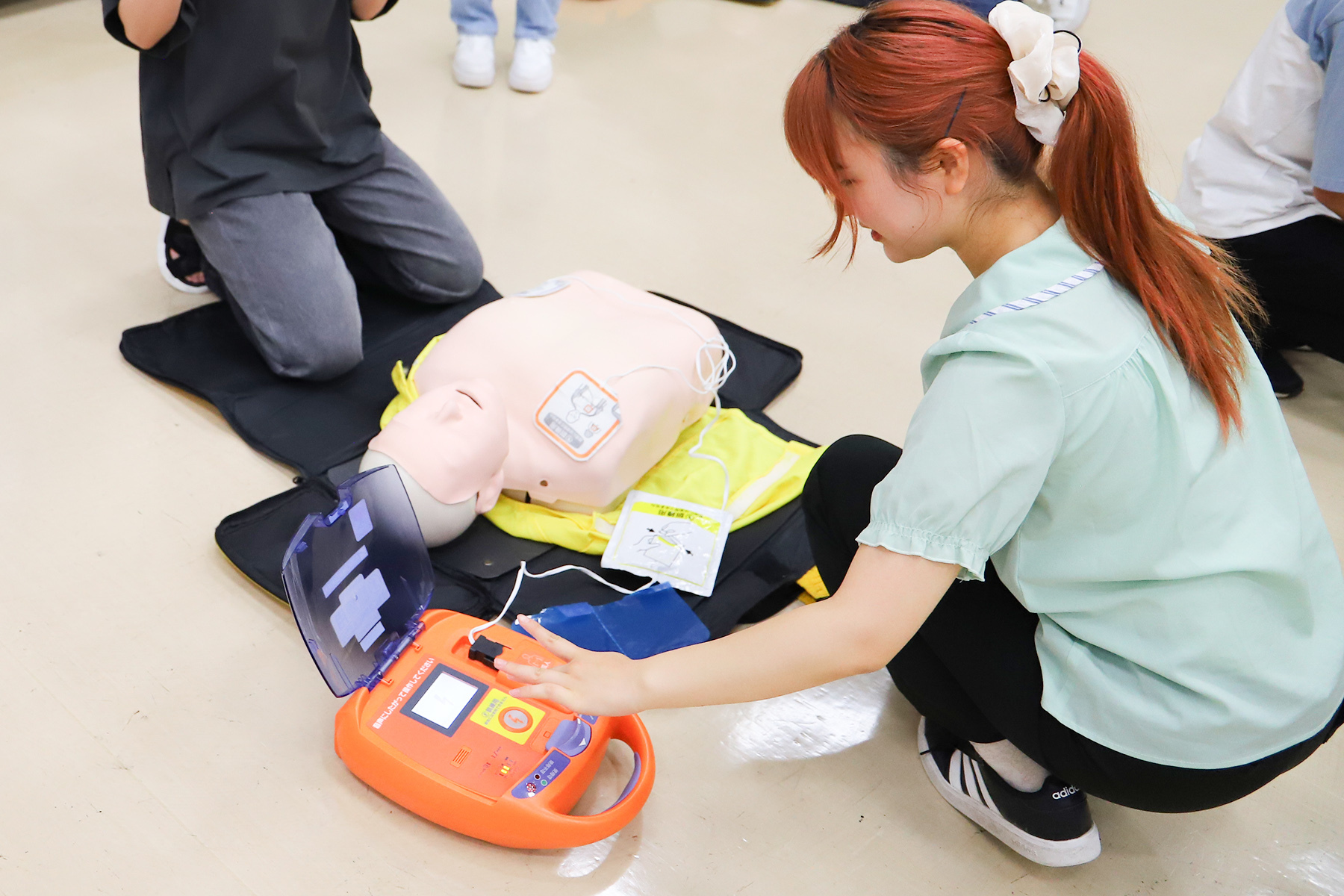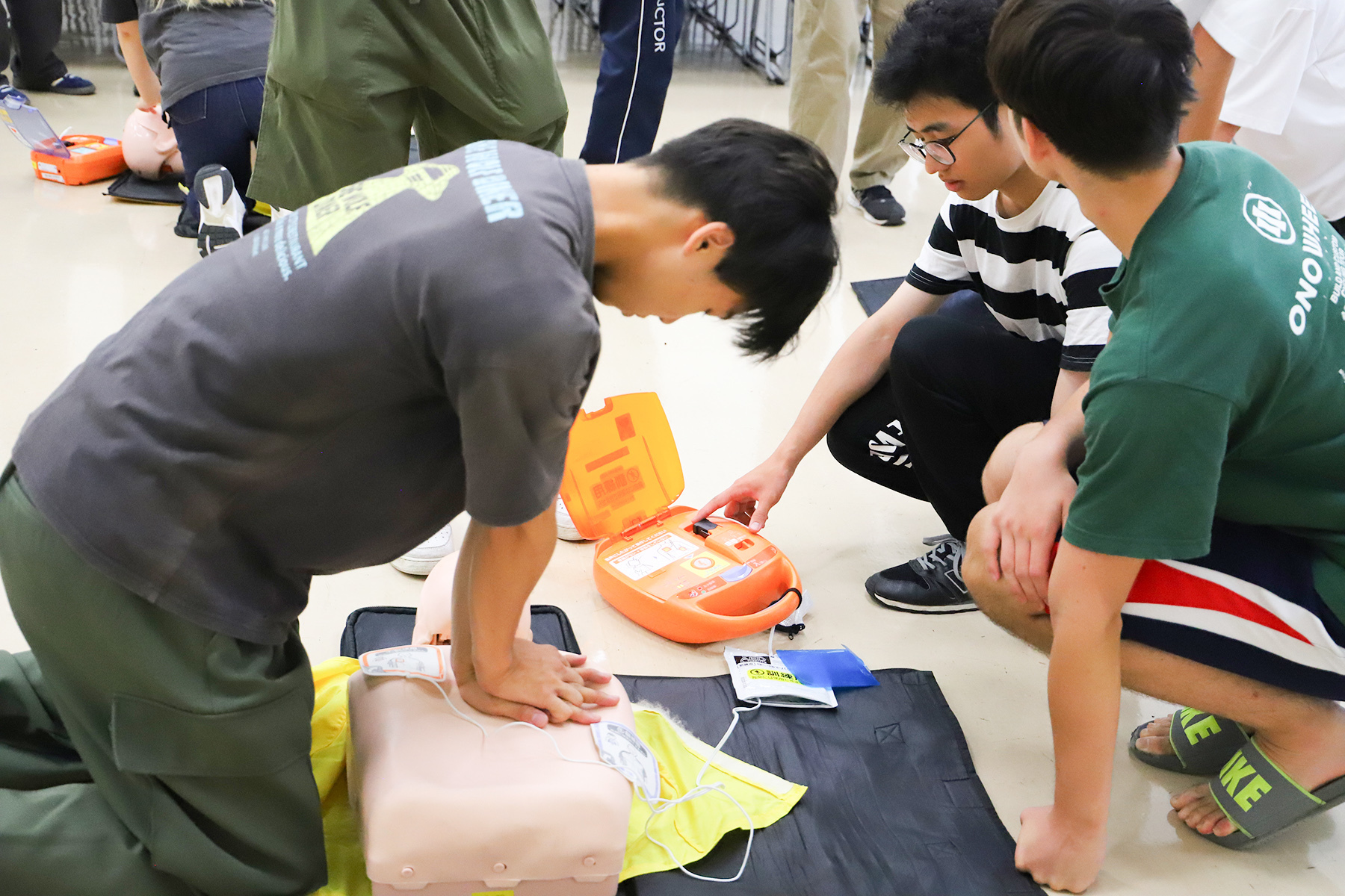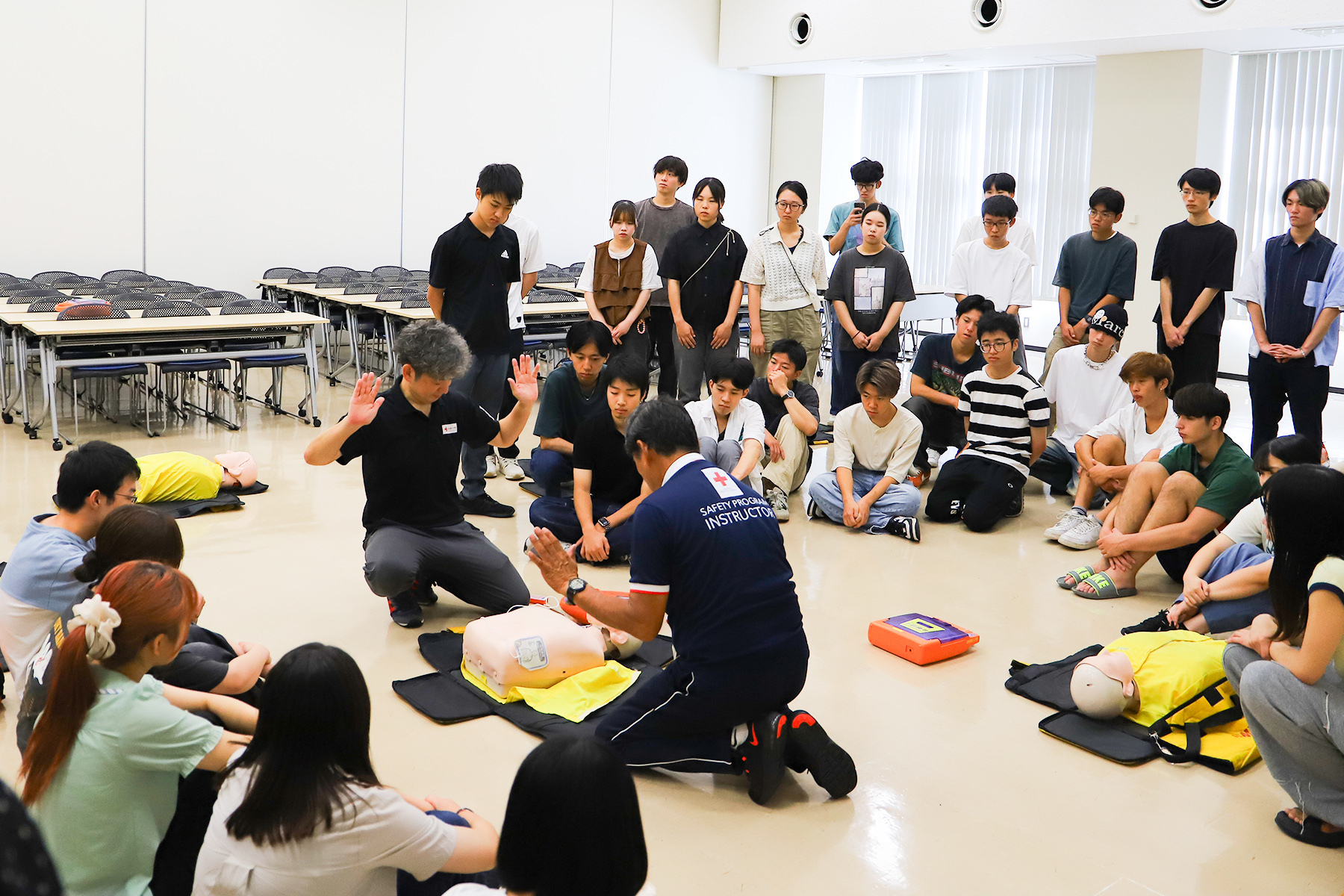 本2科目(4日間の集中講義で実施)では、学内教員及び実務者による講義やグループワークを通じて、自然災害への理解を深め、防災・復興に必要な知識とスキルを多角的に学び、将来、防災士として地域で活躍するための基礎力を養います。令和7年9月2日には、傷病者の観察の仕方、一次救命処置(心肺蘇生、AEDを用いた電気ショック、気道異物除去等)に関する講習を実施し、学生は救急法の基礎について、実技を交えて習得しました。