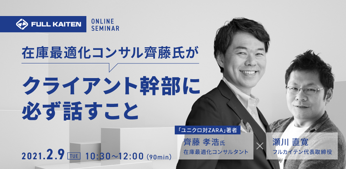 フルカイテン株式会社(本社・大阪市福島区、代表取締役・瀬川直寛)は2021年2月9日(火)、流通業界に多くの顧客をもつ在庫適正化コンサルタント・齊藤孝浩氏を講師に招き、「クライアント企業の幹部に必ず話すこと」をテーマにした講演をオンラインセミナーとして開催します。対談パートでは、新型コロナウイルス危機前から小売・卸売企業が直面する在庫問題を解決する手立てを探るため、弊社代表・瀬川とのディスカッションも実施します。