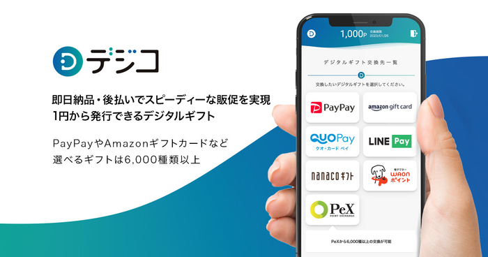 デジタルギフト「デジコ」は、「nanacoギフト」「WAONポイントID」を含む最大6,000種類以上の交換先が選択可能で、企業の販売促進キャンペーンをはじめ、幅広い用途でご活用いただくことができます。最短で即日に納品でき、後払い決済により企業の販売促進を簡単・スピーディーにサポートいたします。デジコは今後も、さらに交換先のバリエーションを強化し、より便利なデジタルギフトを目指してサービスを充実させていく予定です。