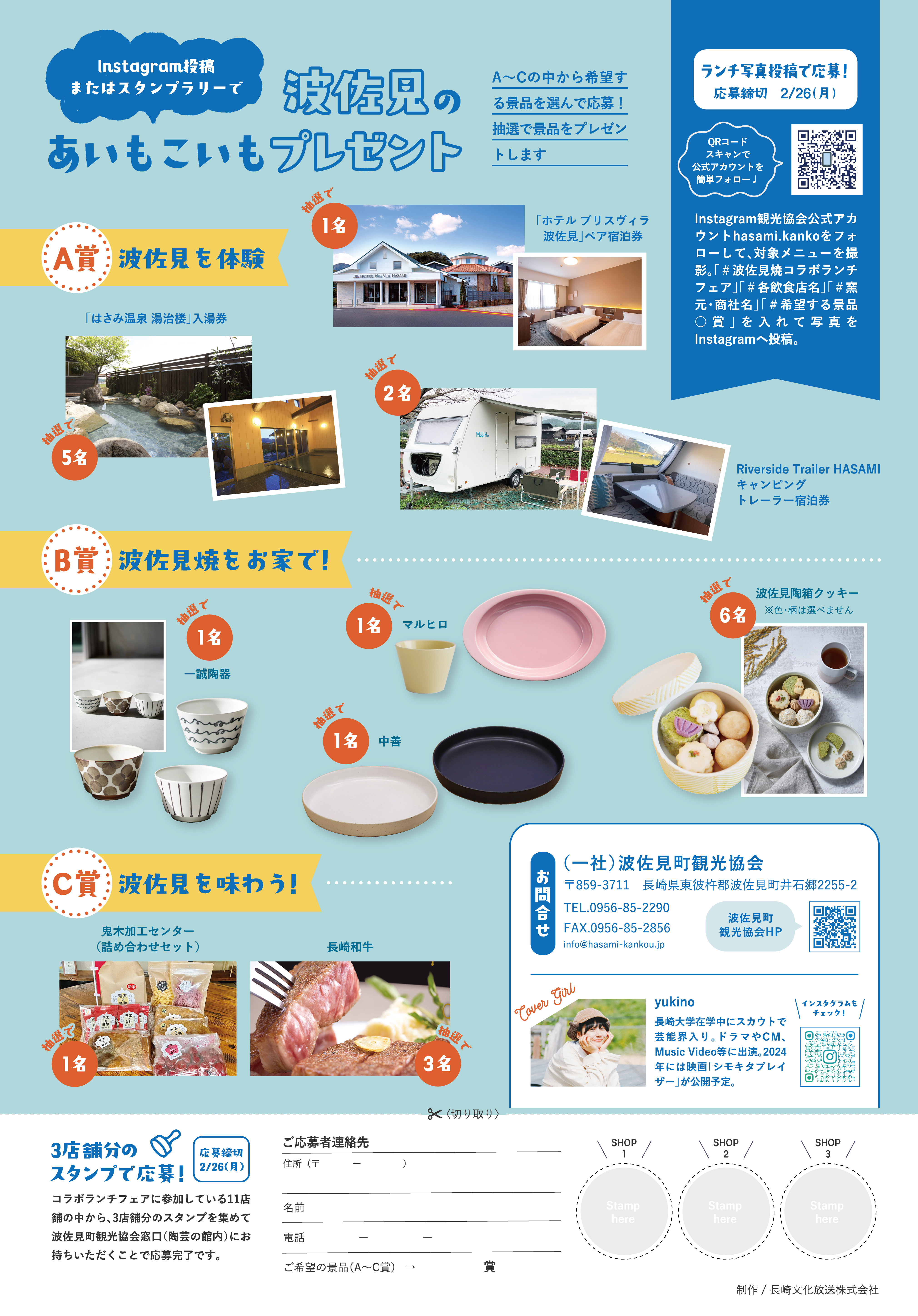 コラボランチフェアに参加している11店舗の中から3店舗でお食事後スタンプをゲット。3店舗分のスタンプを集めて、波佐見町観光協会窓口(陶芸の館1F)にお持ちいただくと応募完了です。