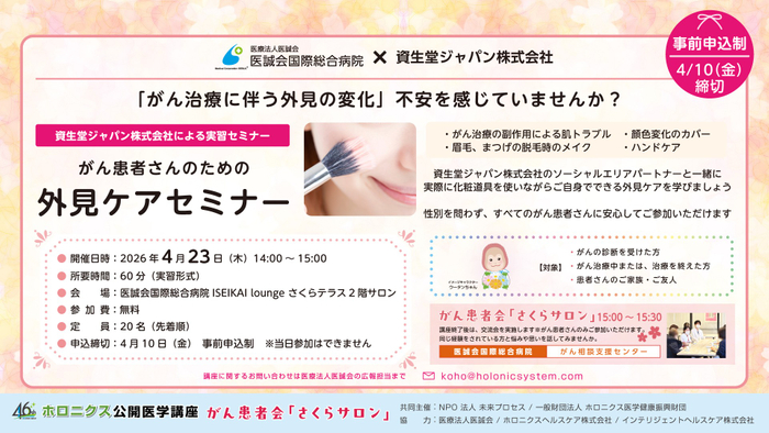 医療法人医誠会(本社:大阪府大阪市、代表者:谷 幸治)は、2026年4月23日に医誠会国際総合病院において、資生堂ジャパン株式会社 ソーシャルエリアパートナーを招き「がん患者さんのための外見ケアセミナー」を開催します。本講座はホロニクス公開医学講座の一つとして実施し、がん治療に伴う外見の変化に関する悩みをテーマに、患者さん自身が実際に化粧道具を使いながら外見ケアを学ぶ実習形式のセミナーです。医誠会国際総合病院初の取り組みで、がん患者さんやご家族が安心して外見ケアについて理解を深める機会を提供します。