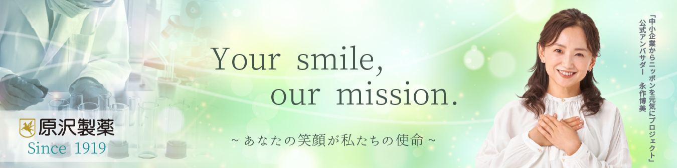 「Your smile, Our mission.(あなたの笑顔が私たちの使命)」を掲げる原沢製薬工業株式会社は、自社が自信をもって提供する「〈第2類医薬品〉ネオレバルミン錠」や「ニューエコフENMスーパー」をより多くの方に知っていただき、お客様の健康と笑顔を支えることを目指しています。