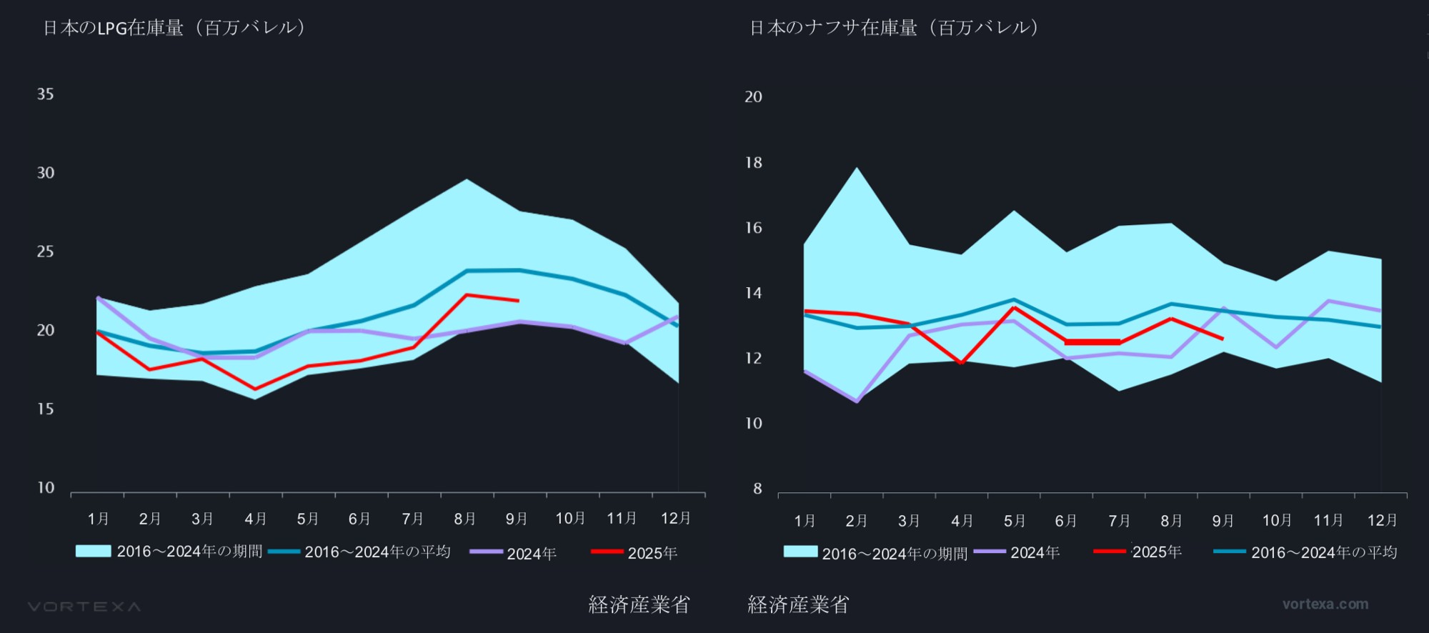 ガス系燃料と並んで弱含むのがLPGやナフサだ。LPGは国内在庫が前年を上回る水準にあり、第4四半期の輸入は積み増しの必要性が低いとみられている(画像2)。さらに、石化マージンの悪化が国内外のスチームクラッカーの稼働を圧迫し、ナフサの輸入も引き続き抑制される。アジアでは日本・中国を含む複数地域でクラッカーの閉鎖・縮小計画が進んでおり、中期的にも需給緩和が続くとの見方が強い。