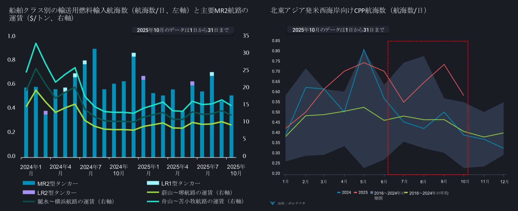 国際的には、米国西海岸(PADD5)で供給ギャップが続いていることから、アジア発の長距離輸送が拡大し、運賃は主要航路で上昇気味だ(画像4)。今後もMR2型タンカーを中心とした航海が活発化する可能性が高く、物流企業や商社にとっては引き続き収益機会となる。