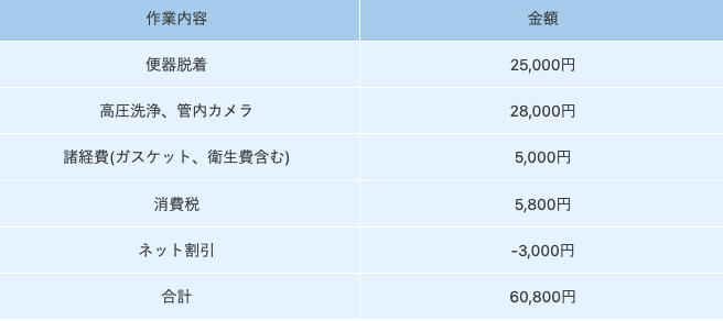 便器の取り外しや、カメラで調査、今後のトラブルを避けるため、他の配管も高圧洗浄機を使用するなど、専門的な対応が必要になり、料金は妥当であると考えられます。