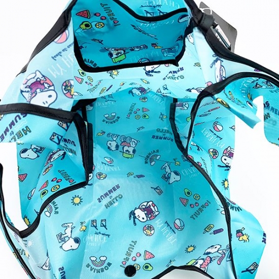 広げると、トートタイプのバッグです。全体に散らされたスヌーピーやブラザーたちのデザインに和みます。畳んだ状態は薄いのですが、マチもあるので収納力もたっぷりですよ。
