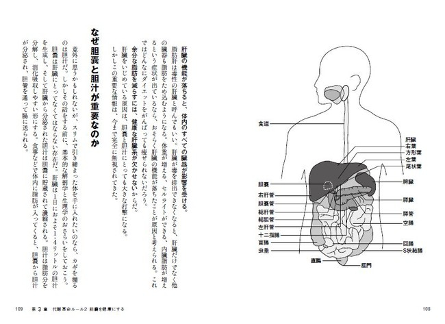 本書のユニークな点は、たとえ「いい脂肪」を摂取しても、きちんと消化吸収できなければ効果は期待できない。そのため本書が提唱するプログラムでは、ダイエットの縁の下の力持ちともいえる「胆嚢(たんのう)」にも注目している。