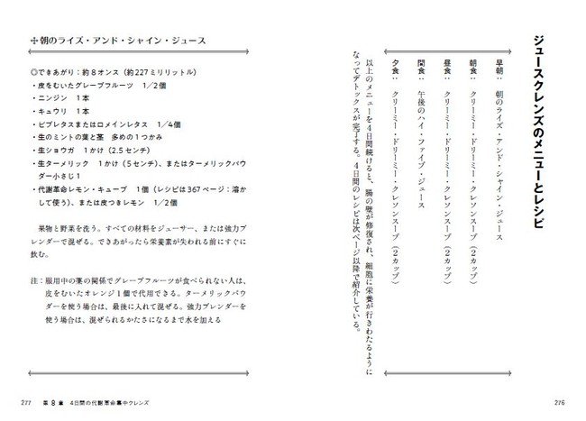 また、巻末では、驚きの効果がある「集中クレンズジュース」と「21日間の食事プランとレシピ」も紹介しています。本書を読めば、単なるダイエット法がわかるだけでなく、現代社会に潜むあらゆる「毒素」に対抗できるようになります。