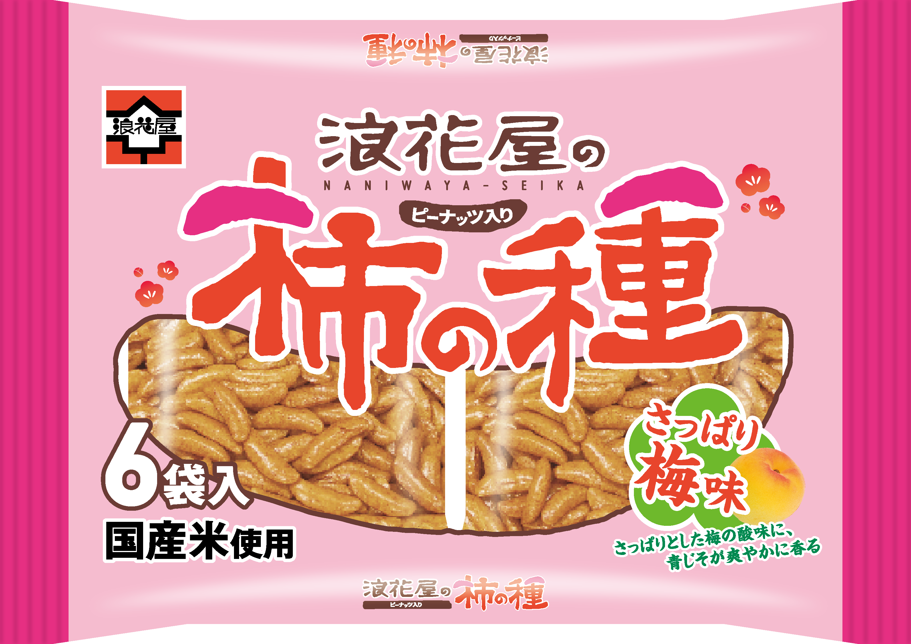 国産米を使用した香ばしい柿の種に、ほどよい梅の酸味と青じその爽やかな香りをプラスしました。ひと口食べると、さっぱりとした味わいが広がり、つい手が止まらなくなる美味しさです。既存商品の「浪花屋の柿の種ピーナッツ入り」の魅力を活かしながら、より幅広いお客様に手に取っていただける味わいとして、定番の梅味を採用いたしました。