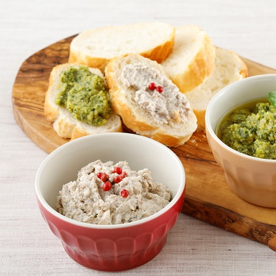「ホワイトマッシュルームの濃厚チーズディップ」はバゲットと一緒に。おしゃれで大人な一品です。