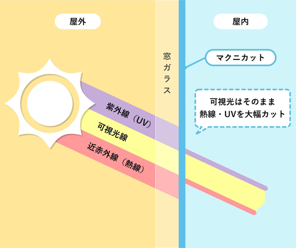 「窓用遮熱塗料マクニカット」は、既存の窓ガラスに塗布するだけで、暑さの主な原因である近赤外線(熱線)を効率的にカットし、室内の暑さや空調負荷を軽減する窓用の遮熱コーティング剤です。太陽光に含まれる「可視光線」は透過させつつ、暑さの原因となる「近赤外線」と、室内環境への影響が懸念される「紫外線」をカットする設計となっています。これにより、視界や明るさを保ちながら、室内に熱が入り込むのを効果的に防ぎます。
