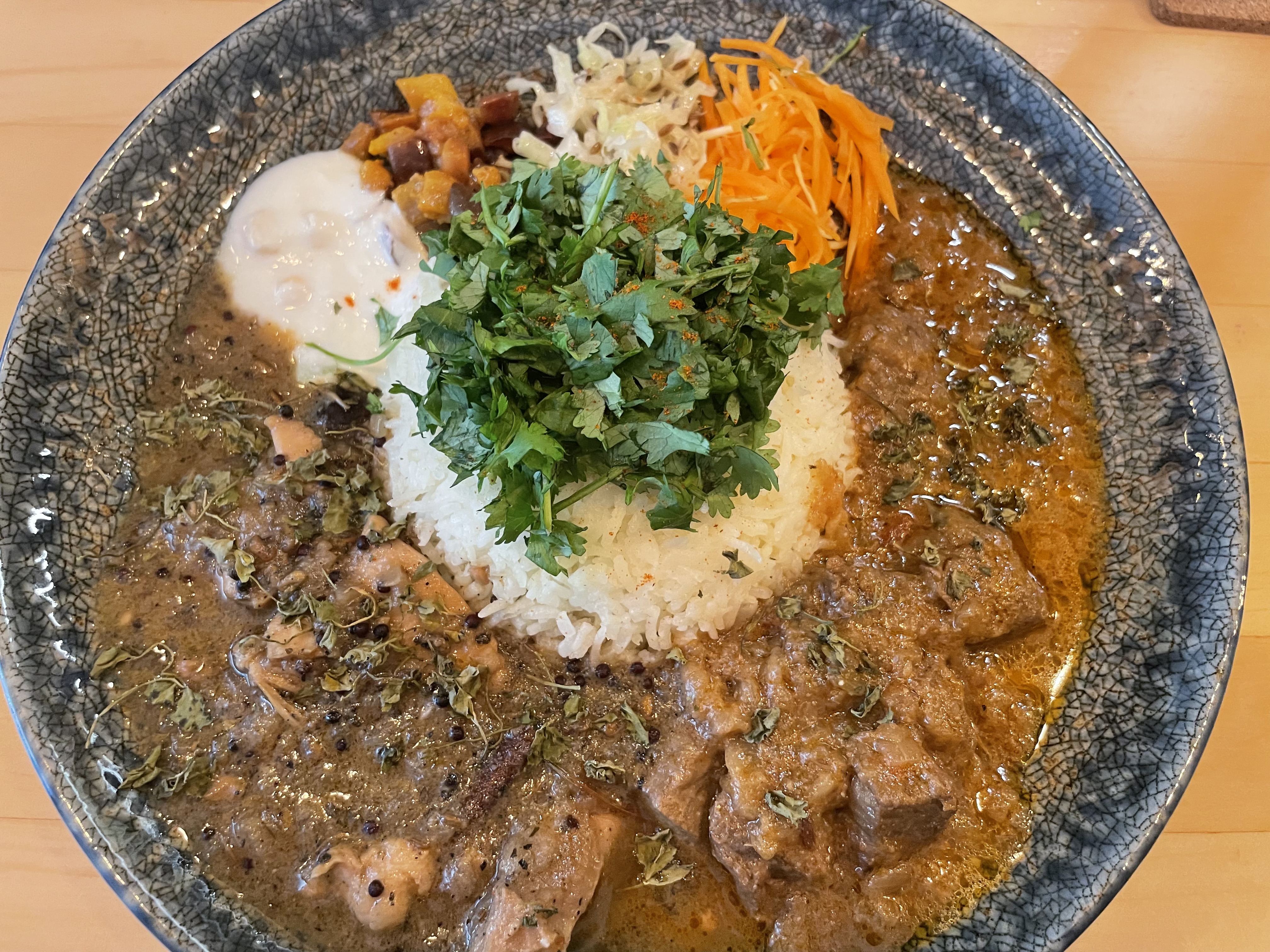 またこれらのカレーは、あいがけで1,400円でも提供されます。本格創作スパイス料理とバスマティライスとブランド米の瑞々しくてふわふわな食感をお楽しみください。