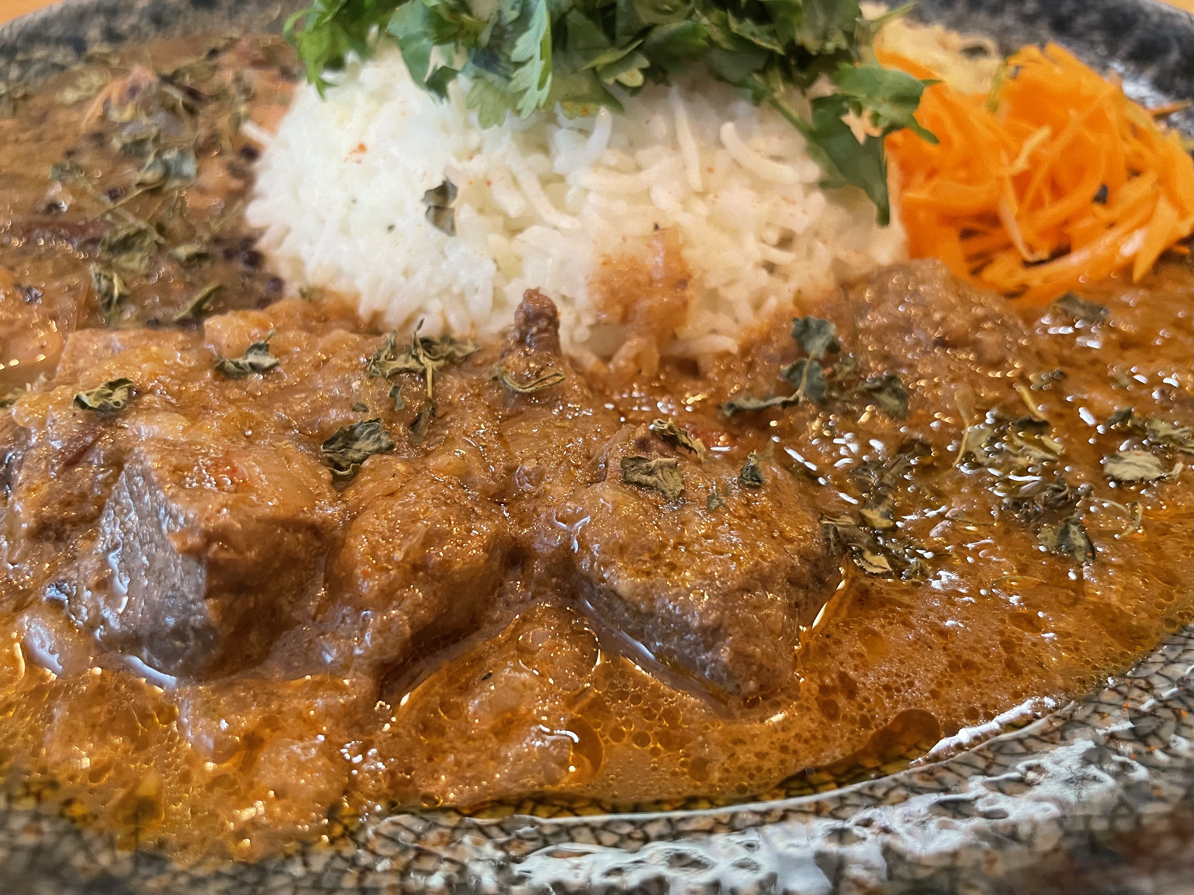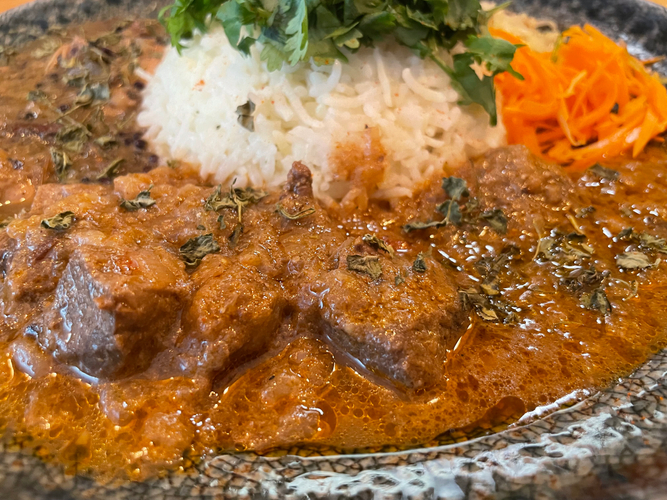 - 南インドのビーフカレーでベースはトマトとヨーグルトの中辛カレーです。