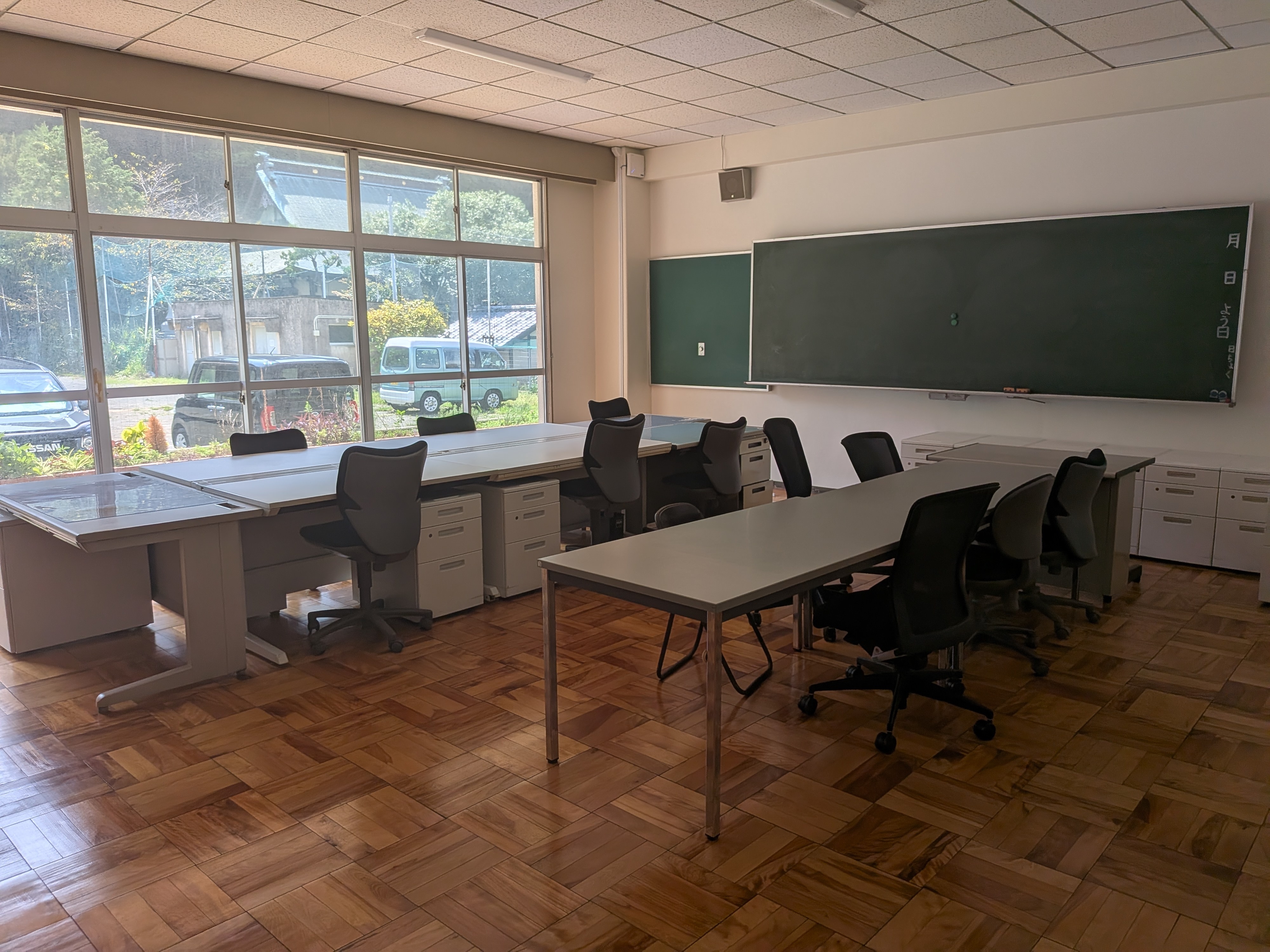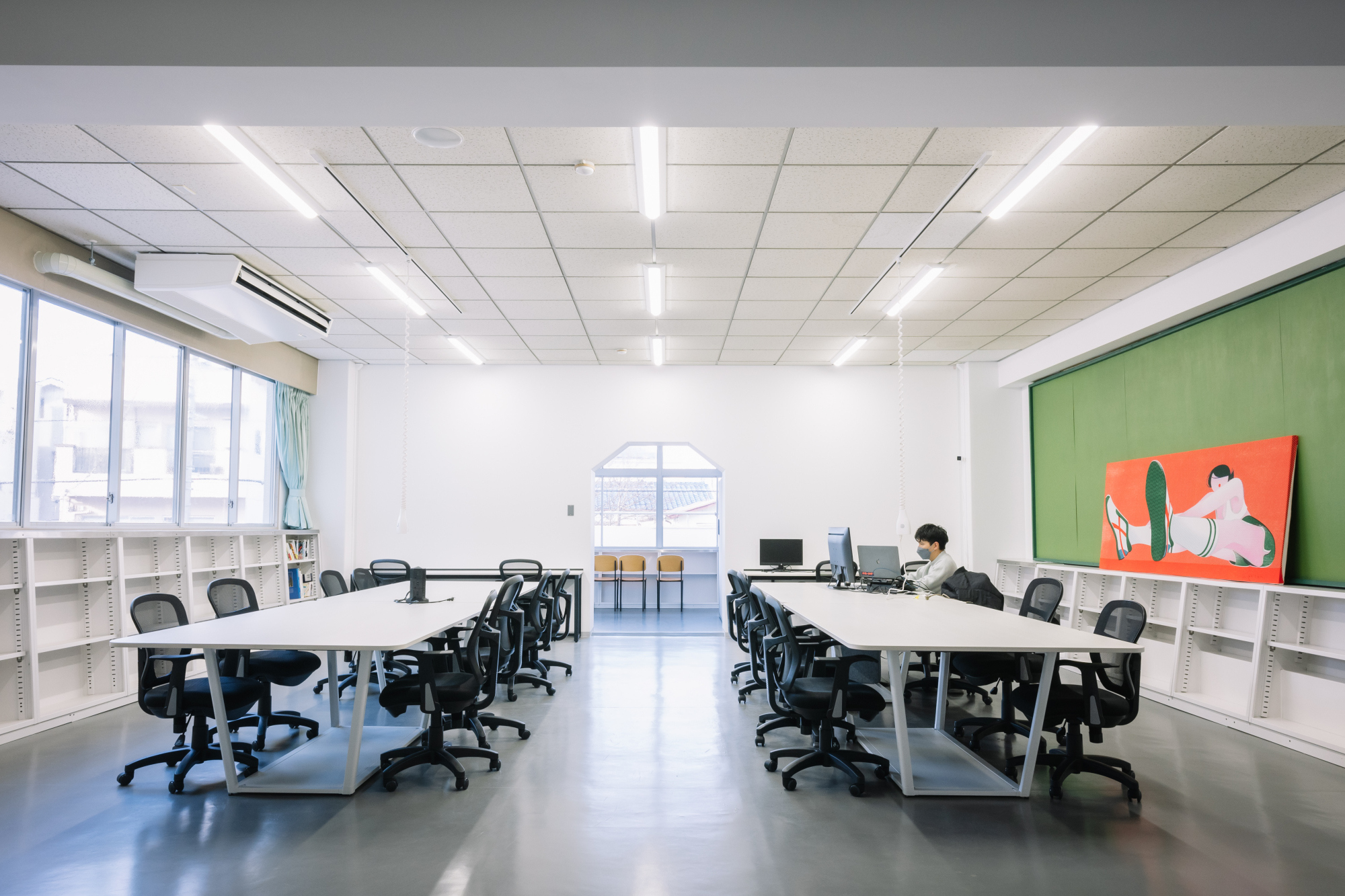 かつての教室の面影を残す「黒板」や「ロッカー」がある空間に、実用的なオフィス家具をセット。PC一台で入居したその日から、ノスタルジーと創造性が共存するユニークな環境で仕事に打ち込めます。