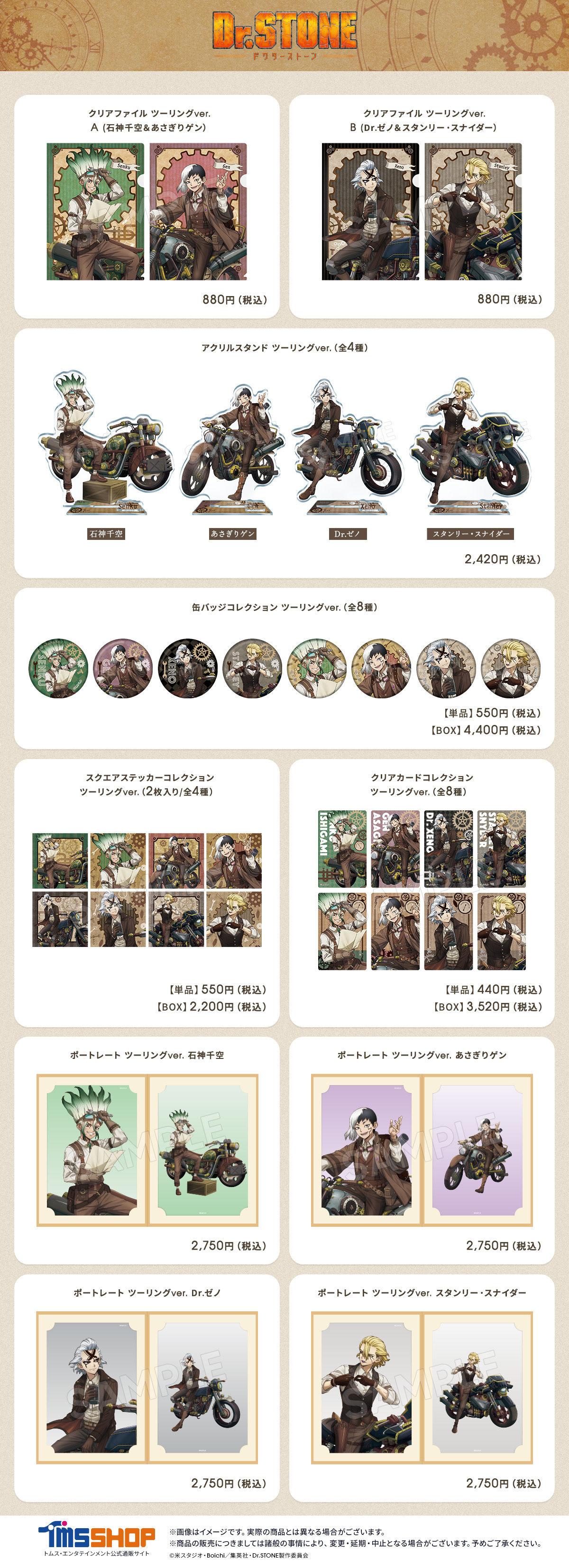 石神千空、あさぎりゲン、Dr.ゼノ、スタンリー・スナイダーがスチームパンクな世界でバイクを整備したり一服したり……「ツーリング」中のふとした一瞬を切り取った描き下ろしキャラクターイラストの商品が登場!