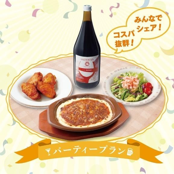 「好き」を詰め込んだパーティー♪ ・フレッシュワイン マグナム(1,500ml) 赤 1,100円 ・小エビのサラダ 350円 ・辛味チキン 300円 ・ミラノ風ドリア 300円