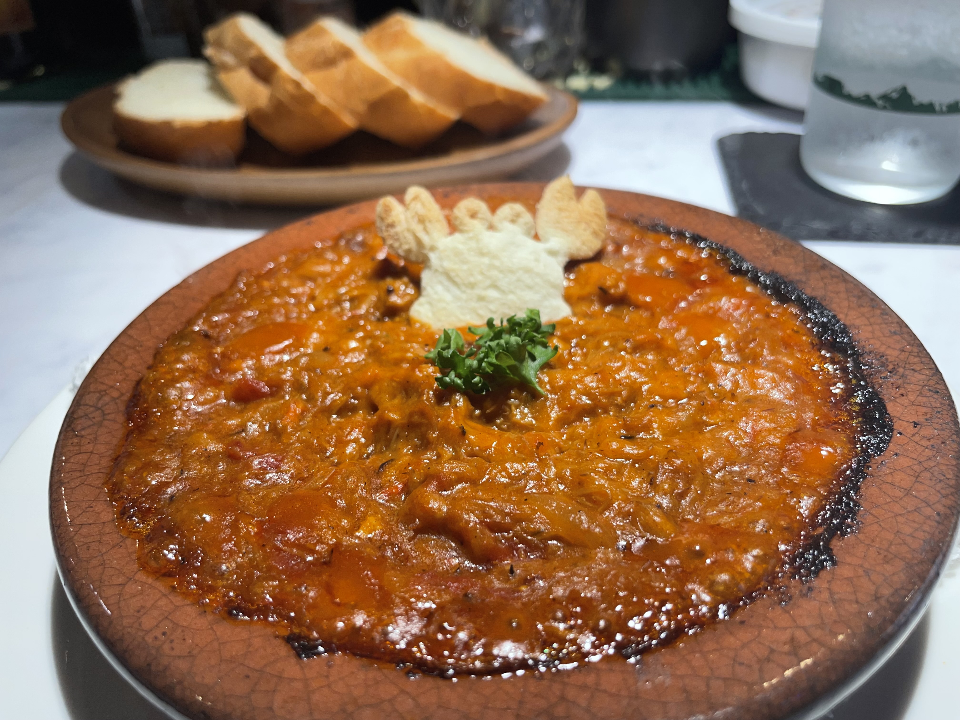 森本シェフはスペイン料理の鉄人シェフの下で修行し、1998年からは小伝馬町や新橋でスペインバルを経営してきました。その中でも一番人気を誇るメニューが「バスク風カニグラタン (cangrejo a la vasca)」です。