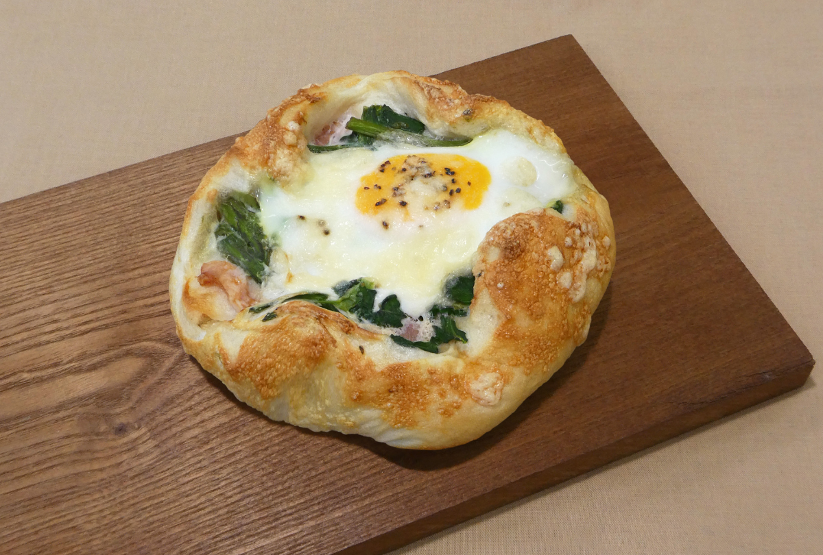 授業でキッシュを作った際、「キッシュをパンにしたら面白いかも!」と思い考案しました。卵をまるごと1個使い、インパクトある見た目に仕上げたところがこだわり!リュスティックは、田舎風という意味合いをもつフランスパンの1種で、外はカリカリ、中はもちもちのハード系パンの総称として知られます。