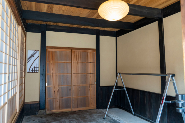 「西津湊かさまつ」の玄関を開けると、昔ながらの広々とした土間スペースが広がっています。この土間スペースには、サイクルスタンドを配置しており、美しい若狭湾沿岸をサイクリングする途中で、大切な自転車と共にゆっくりとお休みいただくことができます。