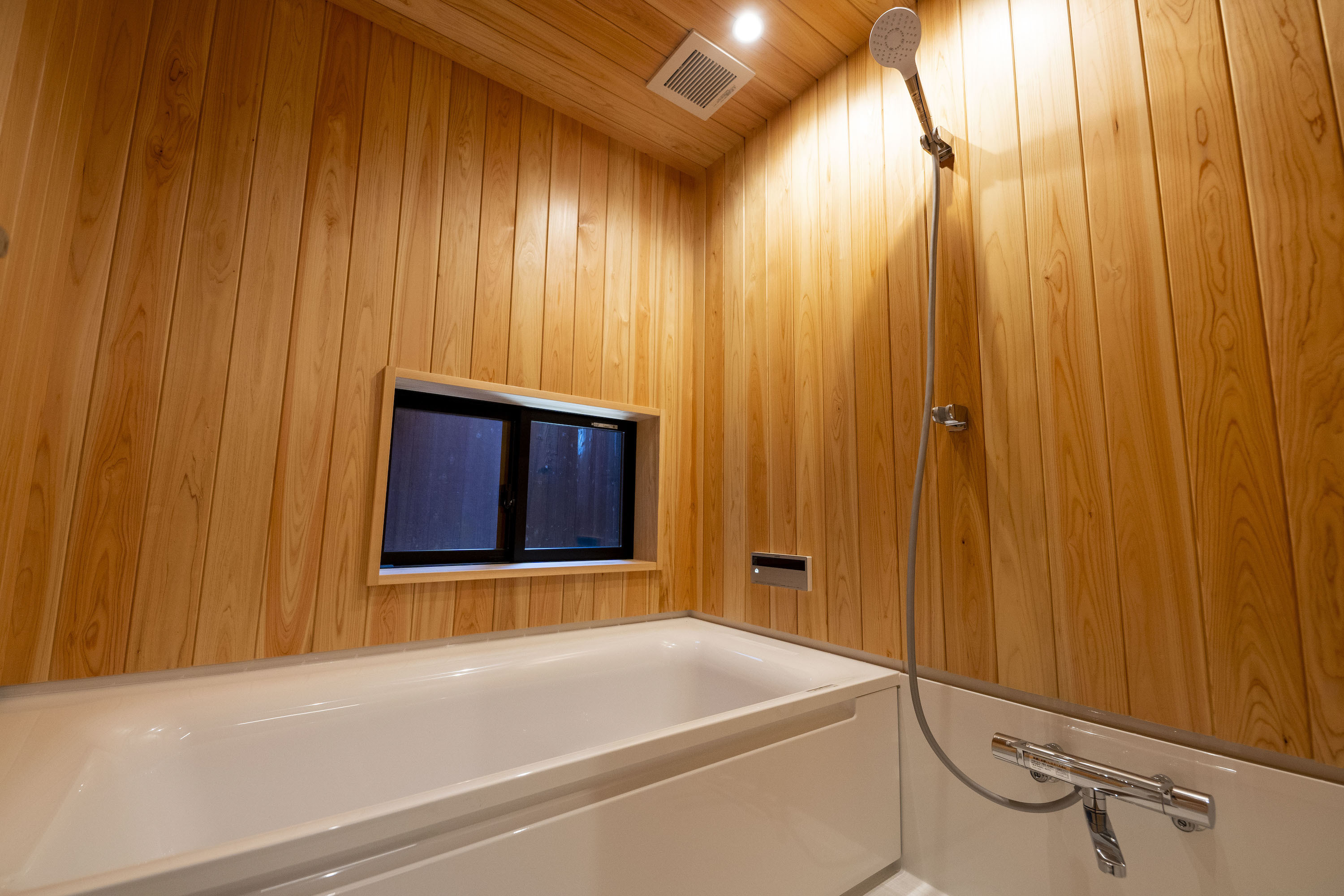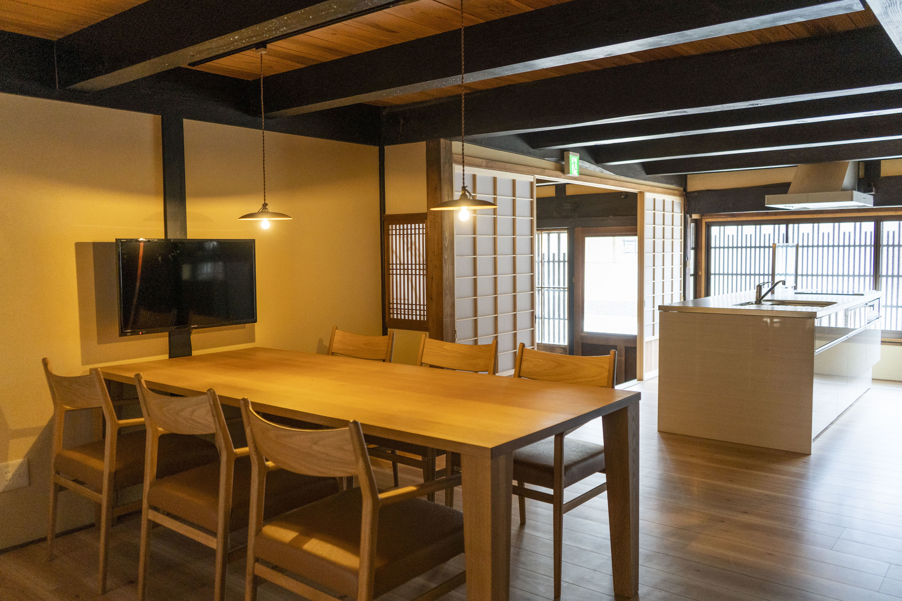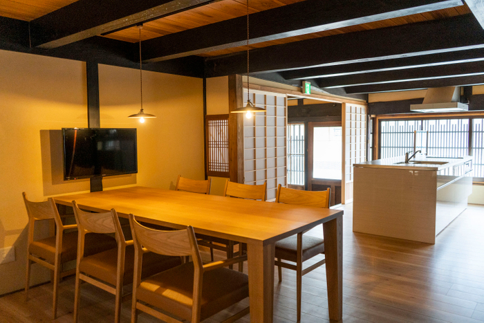 「西津湊かさまつ」の主屋の1階は、仕切りのない1間のリビングダイニングキッチンとし、中央にアイランドキッチンを配しています。例えば、ご家族や友達で1棟を貸し切って料理を楽しんだり、釣り客が多く訪れる西津地区の特性を生かし、釣った魚を捌いて食べたりすることも可能です。