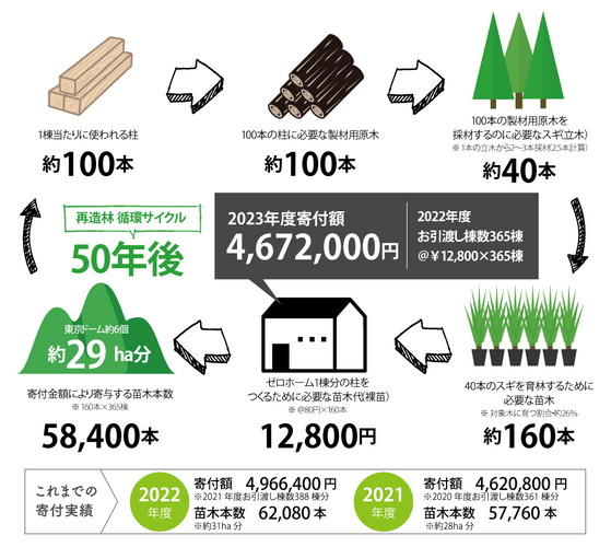 株式会社ゼロ・コーポレーション(本社:京都市中京区、社長:菊本雅幸、以下「ゼロホーム」)は、宮崎県のスギ植林・育林を目的とする再造林支援2023年度分として、約467万円の寄付金の贈呈を2023年12月に行いました。この寄付は、ゼロホームが独自で進める「苗木を還そうプロジェクト(以下、「苗木プロジェクト」)」の一環として2021年にスタートし、今回で3回目です。同プロジェクトにおけるこれまでの寄付金合計は、約1425万円となりました。