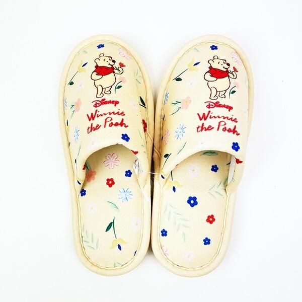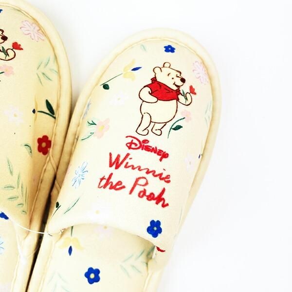 くまのプーさんのスリッパ「リーフフラワーガーデン」は、葉っぱとお花をモチーフにした、ナチュラルでやさしい雰囲気のデザイン。おだやかな表情のプーさんが描かれていて、見ているだけでほっと癒されます。