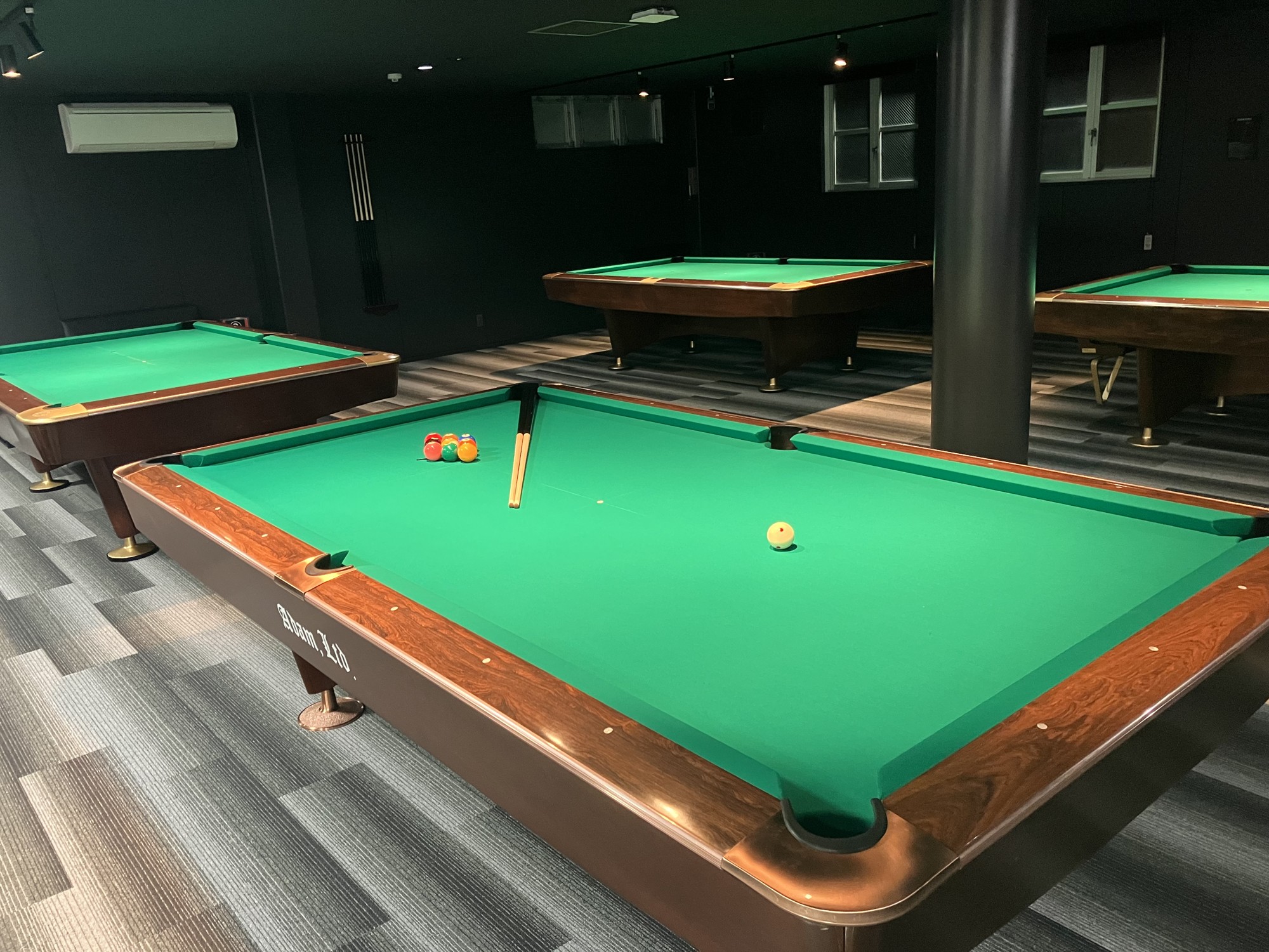 ビリヤード:ビリヤード台は4台設置し、台と台の間隔を広く確保しています。テーブルや椅子も備え、周囲を気にせず快適にプレイできます。