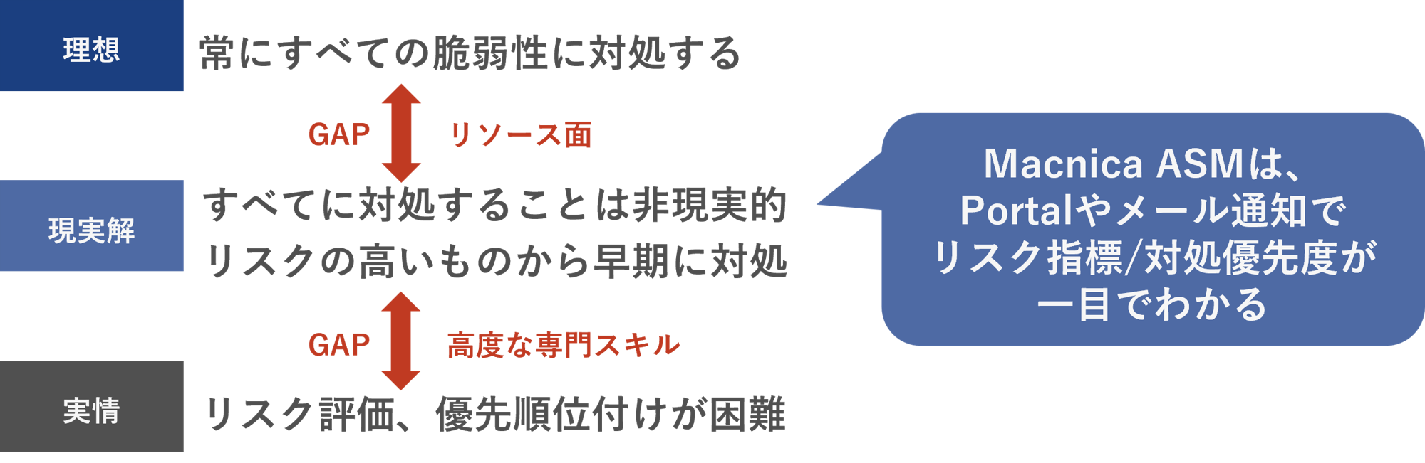 Macnica ASMの脆弱性優先順位付けは、高度な脅威インテリジェンスを用いて、脆弱性の中でも悪用可能性がある “真に対処が必要なリスク” を判断し、お客様へご案内します。