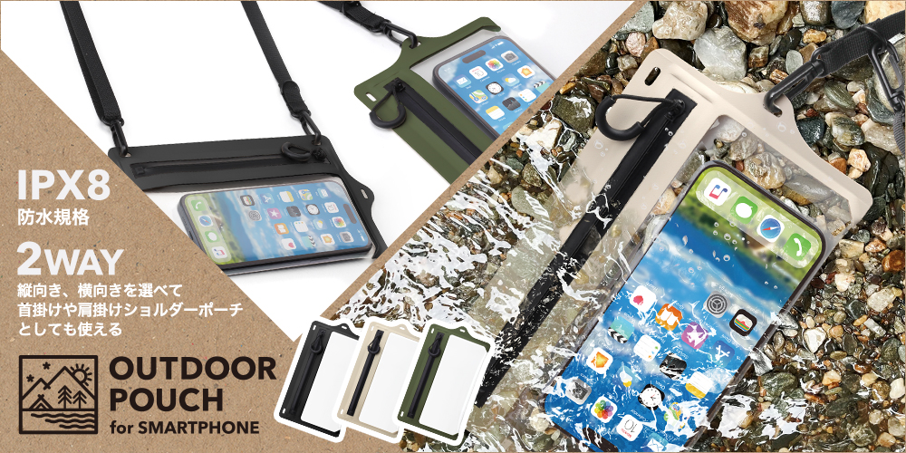 首かけ、肩かけ、どちらにも対応し、アウトドアで幅広く活躍できる汎用防水ポーチ