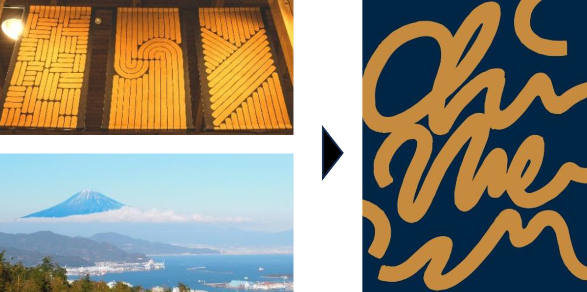 生産地域の代名詞である、富士山と駿河湾が共存する静岡の環境から着想。筆記体にも見えるようなデザインで、和の要素と洋の要素を混在させた抽象的なデザインとしました。