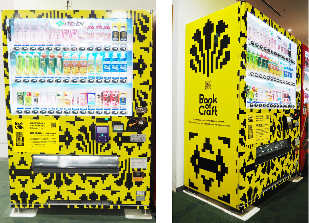 780年以上もの歴史を持つ博多織。多くの経糸に、緯糸を強く打ち込むことで厚く、張りのある生地に織り上がるのが特徴で和服や浴衣の帯として愛され続けてきました。本コラボレーションでは、1928年創業の博多織メーカー・株式会社鴛海織物工場と、緑茶飲料の世界No.1ブランド「お~いお茶」を生産販売する株式会社伊藤園、そしてクリエイターのMasatoo Hirano氏がコラボ。福岡空港の国際線旅客ターミナルビルに設置されている株式会社伊藤園の自動販売機1台に、Masatoo Hirano氏がリ・デザインした博多織柄をラッピングし、海外からの旅行者にも広くアピールします。