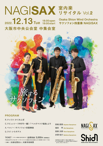 日本で最も長い歴史と伝統を誇る交響吹奏楽団のOsaka Shion Wind Orchestraを有する公益社団法人大阪市音楽団(本社:大阪市住之江区/理事長:石井徹哉)は、2022年12月13日(火)に大阪市中央公会堂にて、「NAGISAX 室内楽リサイタル Vol.2 〜旅するサクソフォン〜」を開催いたします。