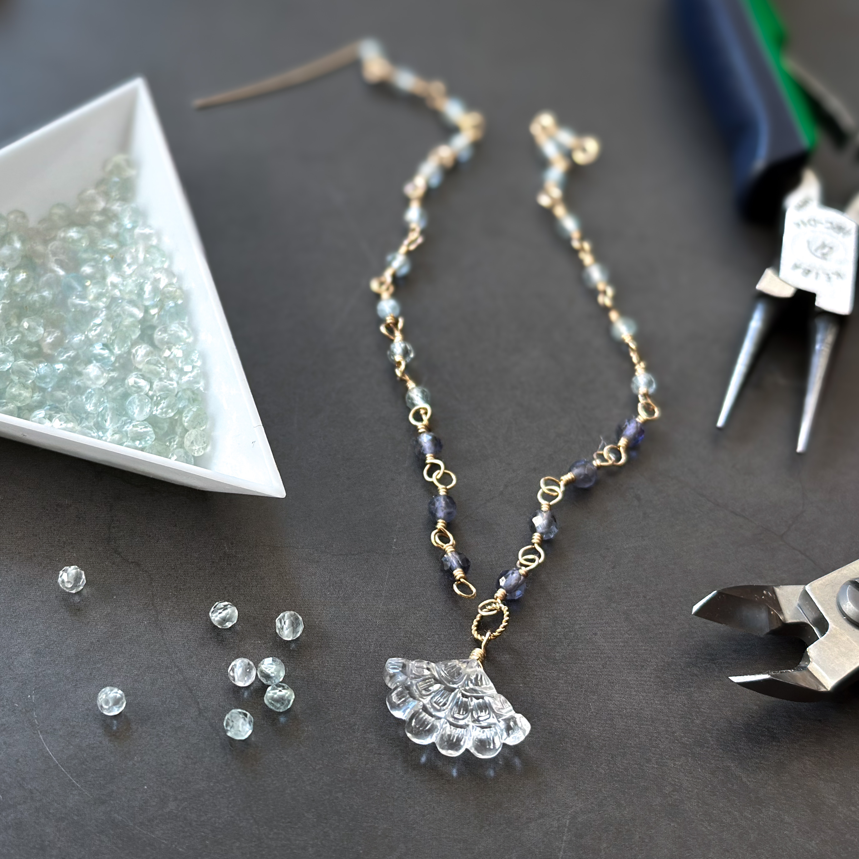 ■ 技法のこだわり:手仕事が生む「繊細な揺れ」 marimelloのアクセサリーの最大の特徴は、3mmという極小の天然石を、14kgfワイヤーを用いて手作業で繋ぎ合わせる「めがね留め」という技法にあります。 一般的なジュエリーで行われる金属の溶接(ロウ付け)や枠留めとは異なり、石の一つひとつが自由な可動域を持つため、わずかな動作で繊細に揺れ、多方向から光を捉えて輝きます。既製品にはない、手仕事ならではのしなやかさと緻密さを追求しました。