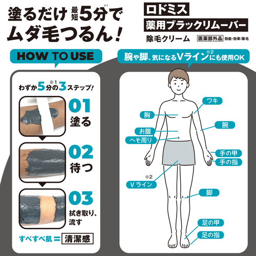 黒いクリームなので肌に塗った箇所が一目瞭然。除毛クリーム初心者が失敗しがちな塗りムラを防ぎます。また拭き取りや洗い流しの時もクリームの肌残りを減らします。