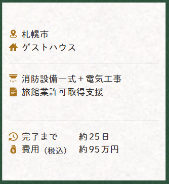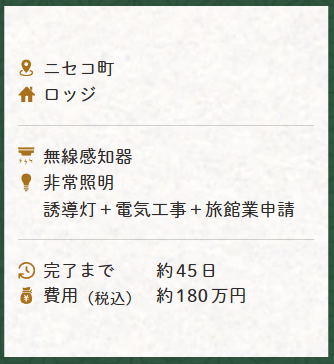 インバウンド需要が急増する札幌・富良野・ニセコエリアを中心に、複雑な日本の消防法への対応から、多言語でのコンサルティング、設置工事、旅館業許可申請までを一括で提供。多言語(日・英・中)対応により、外国人オーナー様の円滑な事業開始を強力にバックアップします。