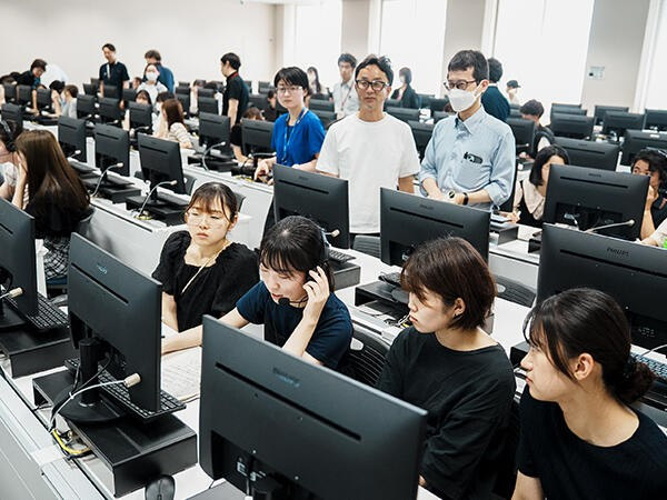 薬学部ではこれまでにもコミュニケーション能力教育に力を注いできましたが、さらなるトレーニング機会提供と質を向上させるために導入したのが「AIオンライン服薬指導システム」です。学生はモニターに映し出された患者役のアバターとリアルな会話を交わした後に学習評価を受け、課題を発見して自らのコミュニケーション能力を高めていきます。このシステムは薬剤師として実務経験を積んだ牛田 誠 准教授と、AI技術により「学びの質」を進化させるエキスパートとして知られる株式会社NTT ExCパートナーとの共創によって開発されたもの。学生たちは時間や場所にとらわれることなく、実践的なトレーニングを積めるようになりました。